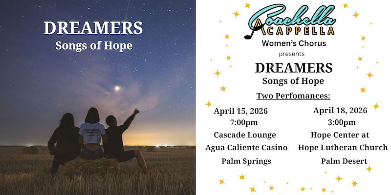 We are women who love singing and are looking for a place to belong, develop lifelong friendships and sing beautiful music (mainly in the Barbershop and pop style). We entertain and inspire audiences in the Coachella Valley and beyond. We always welcome new members and aspire to represent the diverse demographic of our valley in terms of age, race, ethnicity, sexual orientation and gender identity. Women are welcome in this group as long as they sing and are ready, willing and able to work hard toward the goal of being the best women's chorus around! If you want to sit in, please send an email to our Membership Director at Membership@CoachellaAcappella.org.